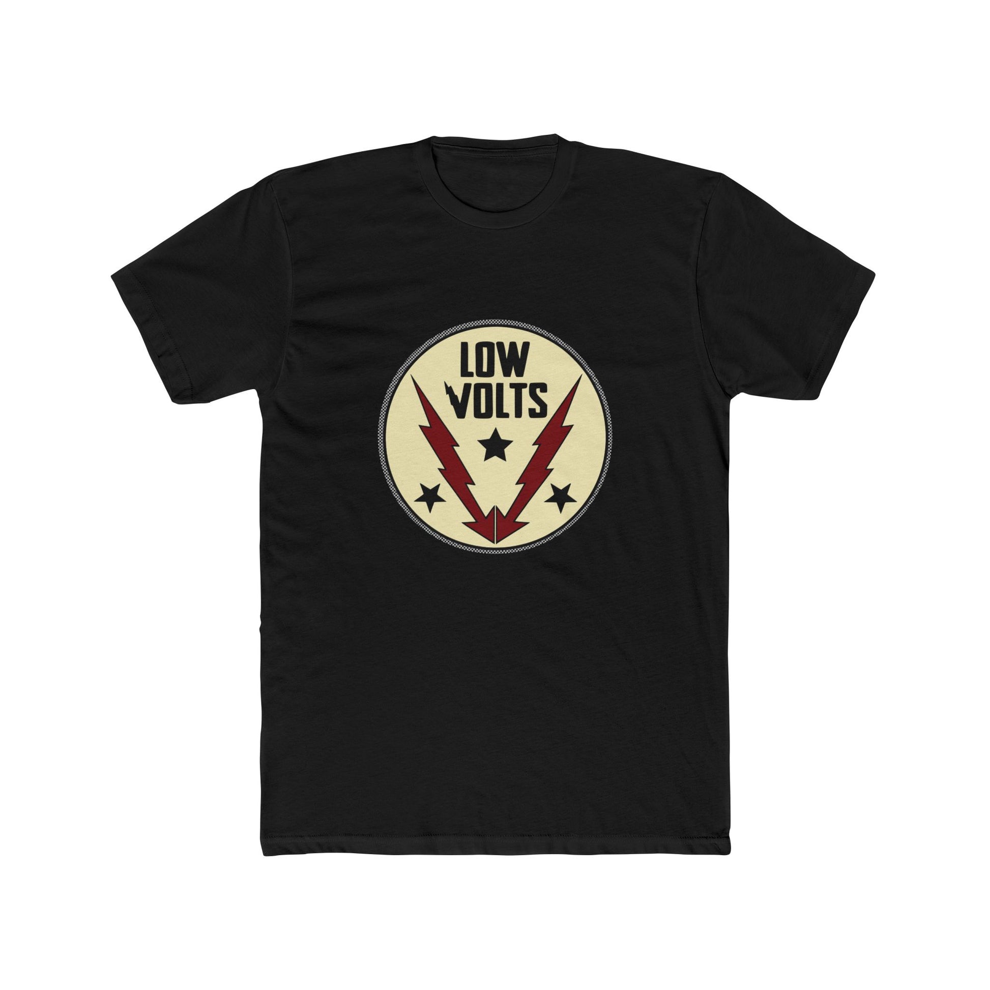 The Low Volts circle badge — bolts, stars, and the name that said it all. Tim's great-grandfather "Doc" Lowman was sentenced to the electric chair before being miraculously freed. The name Low Volts carries that story forward.